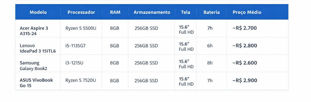 ModeloProcessadorRAMArmazenamentoTelaBateriaPreço MédioAcer Aspire 3 A315-24Ryzen 5 5500U8GB256GB SSD15.6” Full HD7h~R$ 2.700Lenovo IdeaPad 3 15ITL6i5-1135G78GB256GB SSD15.6” Full HD6h~R$ 2.800Samsung Galaxy Book2i3-1215U8GB256GB SSD15.6” Full HD8h~R$ 2.600ASUS VivoBook Go 15Ryzen 5 7520U8GB256GB SSD15.6” Full HD7h~R$ 2.900